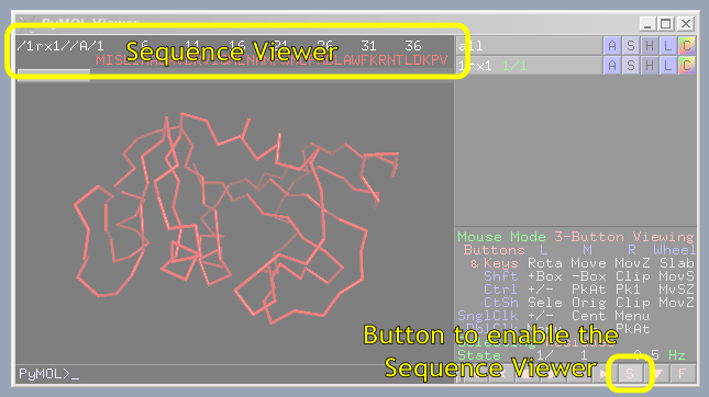 Save the file and launch PyMOL. You should see a blue background. Fetch PDB 1rx1 (as in Part 1) and hit the F1 key, this should show a nice cartoon with ligand representation. You should also see the sequence viewer by default.