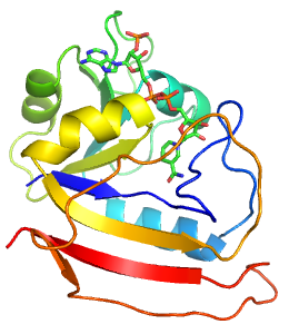 Save the file and launch PyMOL. You should see a blue background. Fetch PDB 1rx1 (as in Part 1) and hit the F1 key, this should show a nice cartoon with ligand representation. You should also see the sequence viewer by default.