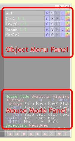 PyMOL displays a movie panel with a frame slider at the bottom of the window. Right click on the panel to insert or delete key frames. The Motions Mouse Mode is used to store object specific key frames.