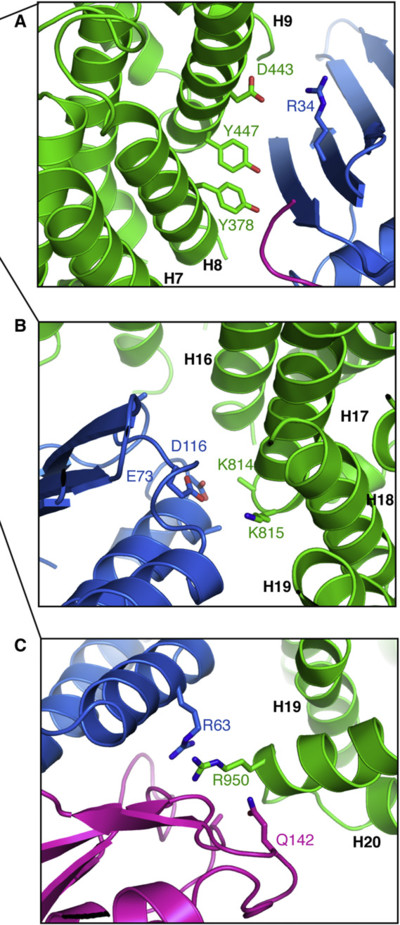 Based on the previous script (figure 2 B), create the sub-figures A, B and C from figure 4 in the same paper. Those are close-ups on inter-chain contacts, for which it shows stick representation of the involved residues. The following command will show sticks for residues D443 and Y447 of Importing 13, and color non-carbon atoms with a by-element coloring scheme: show sticks, chain F and resi 443+447 color atomic, not elem C Get all residue numbers from the paper figure and put them in your script. Optional: Such a figure will look better with cartoon_side_chain_helper enabled. Interactively set up the three views and for each view put a "set_view ..." followed by "png ..." in your script. Run the script to generate the three PNGs. |
